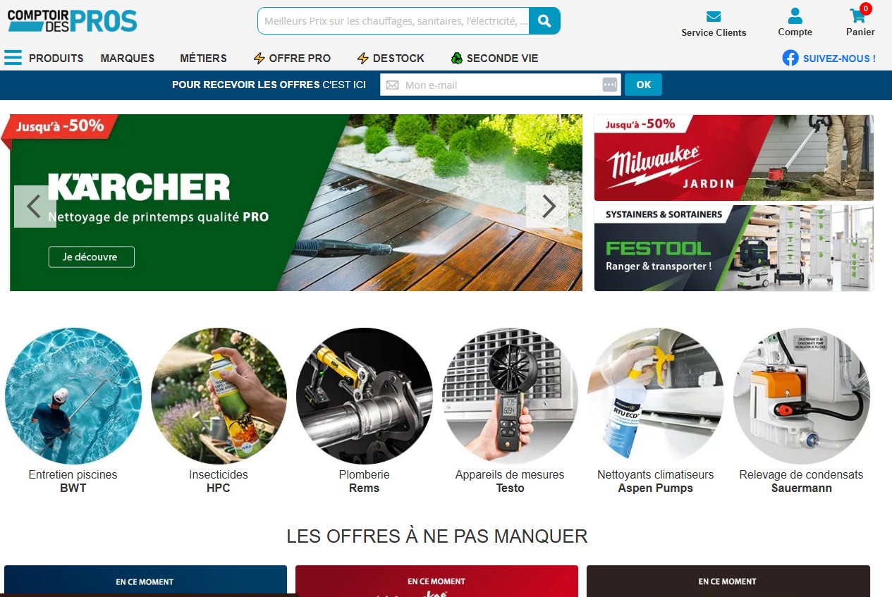 - Produits et services : Comptoir des Pros propose la vente en ligne d’équipements et matériels professionnels (outillage, chauffage, plomberie, électricité, BTP, équipements de protection, etc.), destinés aussi bien aux artisans qu’aux particuliers pour leurs travaux de construction, rénovation ou bricolage.