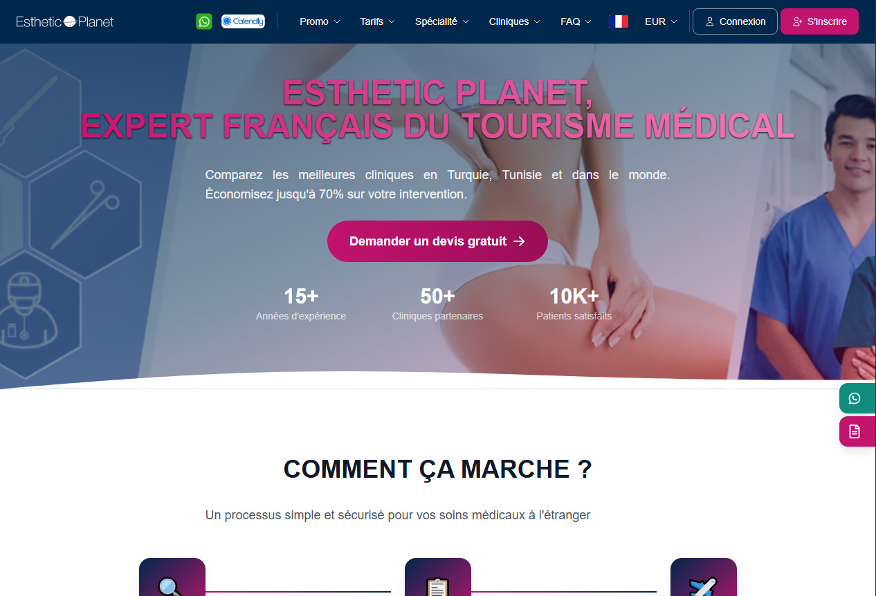 - Produits et services : Esthetic Planet propose un service de tourisme médical international, permettant aux patients de comparer, organiser et réserver des soins médicaux et esthétiques à l’étranger (chirurgie esthétique, soins dentaires, greffe de cheveux, chirurgie bariatrique, etc.).